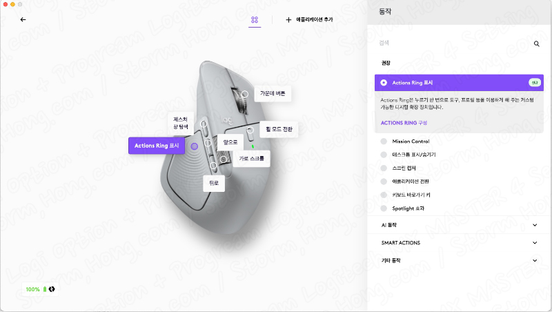 Logitech MX MASTER 4 (로지텍 MX MASTER 4) 에는 전작과 크게 달라진 것은 바로 새로운 측면 버튼과 Actions Ring 의 사용과 측면 아랫부분의 누르른 버튼이 위에서 아래로 누르는 방식에서 새롭게 추가된 측면 버튼의 아래쪽의 버튼을 누르면 설정이 가능한 버튼이 있습니다. 즉, 이를 통해 Action Ring 버튼을 이용하여, 할당된 내용을 키보드를 같이 사용하는 버튼으로 설정 시, 없이 빠르게 사용이 가능합니다.