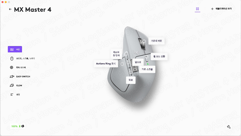 전체적으로 살펴보면 버튼, 기능, 포인트 및 스크롤, East Switch 연결 상태, Flow, 설정 등으로 구성되어 있는 Logitech MX MASTER 3S (로지텍 MX MASTER 3S) 5가지 구성에서, Logitech MX MASTER 4 (로지텍 MX MASTER 4) 에는 새롭게 추가된 햅틱 피드백 부분이 추가되어 있습니다.