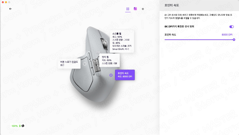 포인트 및 스크롤 기능은 기본적으로 % 로 설정이 가능하며, 8000 DPI 까지 설정이 가능한 버튼을 활성화하면, 포인터를 50 DPI 단위로 세세하게 설정이 가능합니다. (일부 구간에서는 스킵되는 구간이 발생합니다. EX 7800 DPI 이후로는 8000 DPI 로 변하는 단점이 존재하기도 합니다.)