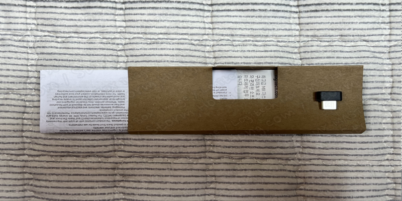 측면에는 전작 Logitech MX MASTER 3S ( 로지텍 MX MASTER 3S) 와 다르게, USB-C to A 충전 케이블이 동봉되어 있지 않다는 내용이 적혀 있습니다. 그리고 Logitech MX MASTER 3S (로지텍 MX MASTER 3S) 에서는 USB - A Logi Bolt (로지 볼트) 수신기가 탑재되었었지만, Logitech MX MASTER 4 (로지텍 MX MASTER 4) 에서는 USB - C Logi Bolt (로지 볼트) 수신기가 탑재되어 출시되었습니다.