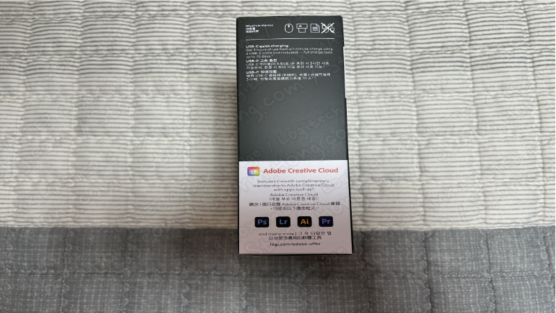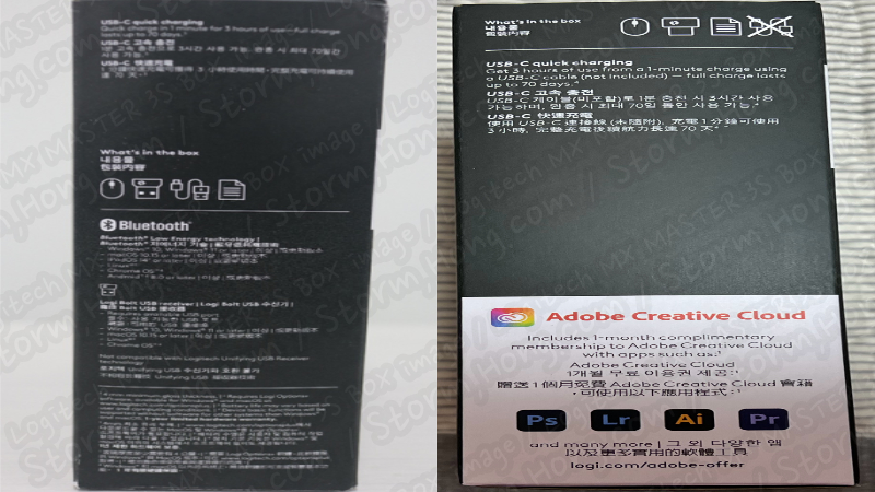 ※ 오른쪽 면에는 구성품 관련 아이콘과 들어있지 않는 제품이 표시되어 있으며, Adobe Creative Cloud 1개월 이용을 할 수 있는 Logitech 홈페이지 URL 주소가 들어 있습니다.