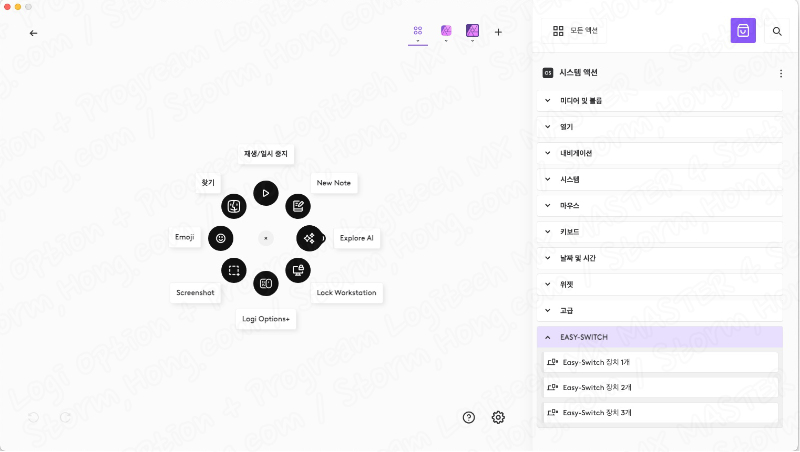 그중에서도 가장 중요하다고 할 수 있는 기능으로, 마우스를 뒤집어서 사용하는 장치 변경 버튼을 누르지 않고도 변경이 가능하며, Logi Option + 프로그램에서 ↑ 위 사진에서 Action Ring 구성을 누른 뒤 ↓ 아래 사진과 같이 선택하면 다음 사진이 나타납니다.