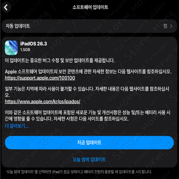 iPadOS 26.3 설치 공간은 약 1.5 GB 입니다. (설치용량은 각 이전에 업데이트하지 않으신분들은 더큰 용량일수있습니다.)이전의 iPadOS 18.7.2 이하 그리고 iOS 18 버전의 업데이트가 되어 있는 경우에만 업데이트가 가능합니다. 만약 설치를 하지 않으신 분들은 iPadOS 26 ↑위 사진의 iPadOS 26 업데이트가 나타나므로 새로운 OS 설치인만큼 공간이 많이 필요할 수 있습니다.