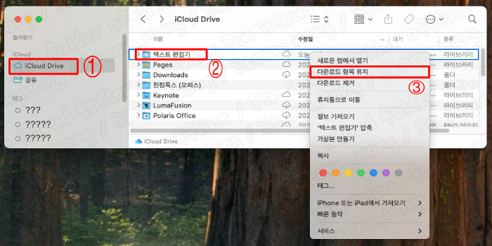iCloud Drive의 파일은 저장 공간 최적화를 위해 맥북에서 삭제되고 클라우드에만 남겨질 수 있습니다. 인터넷이 없는 환경에서는 이 파일들이 열리지 않습니다. 중요한 업무 폴더는 '다운로드 항목 유지'로 설정해 두면 항상 로컬에 보관됩니다.