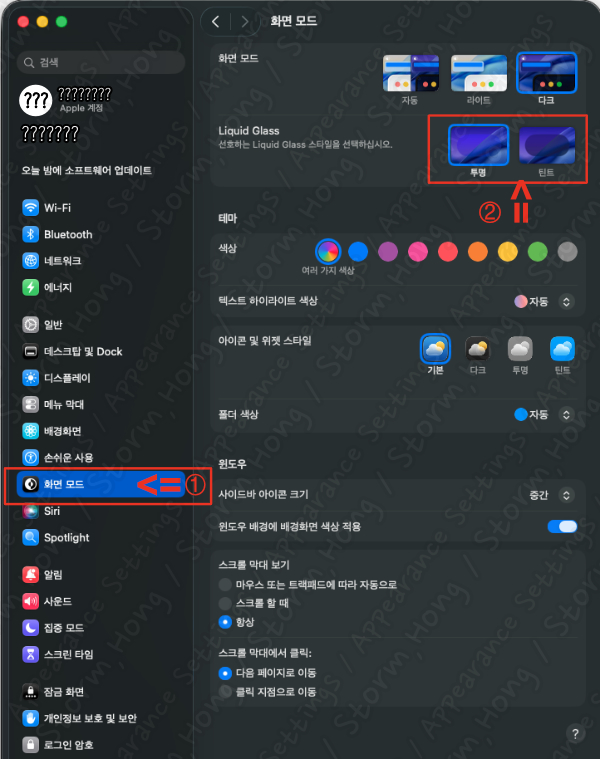 macOS Tahoe의 가장 눈에 띄는 시각적 변화입니다. 창과 메뉴에 주변 배경화면 색상이 반영되는 투명 유리 효과입니다. 'Clear'는 색 반영을 최소화하고, 'Tinted'는 배경 색상이 강하게 반영됩니다.