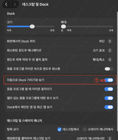 | 오른쪽 하단 | ⌥ + 데스크탑 보기 | 창 정리 후 바탕화면 확인 |